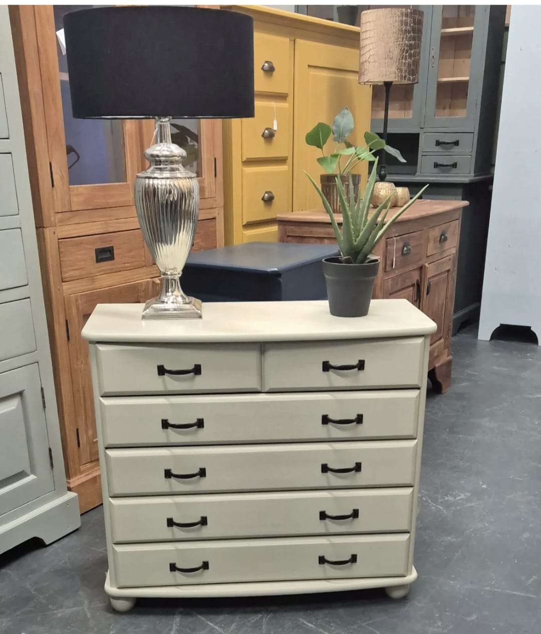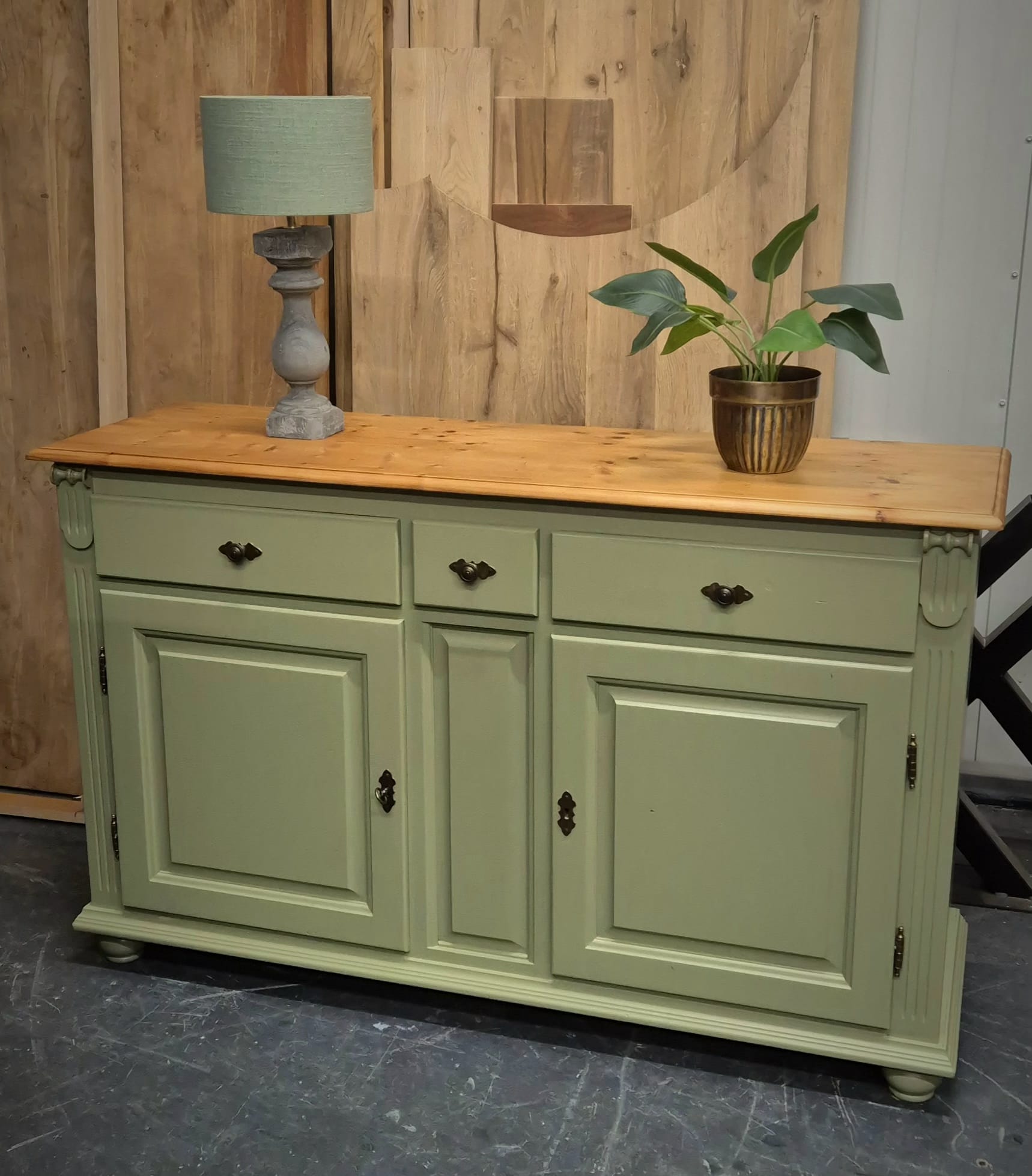 Geef je interieur een warme, landelijke uitstraling met deze prachtige commode/dressoir van massief grenenhout. Het meubel is geschilderd in een tijdloze kleur, waardoor het perfect past in zowel moderne als klassieke interieurs.