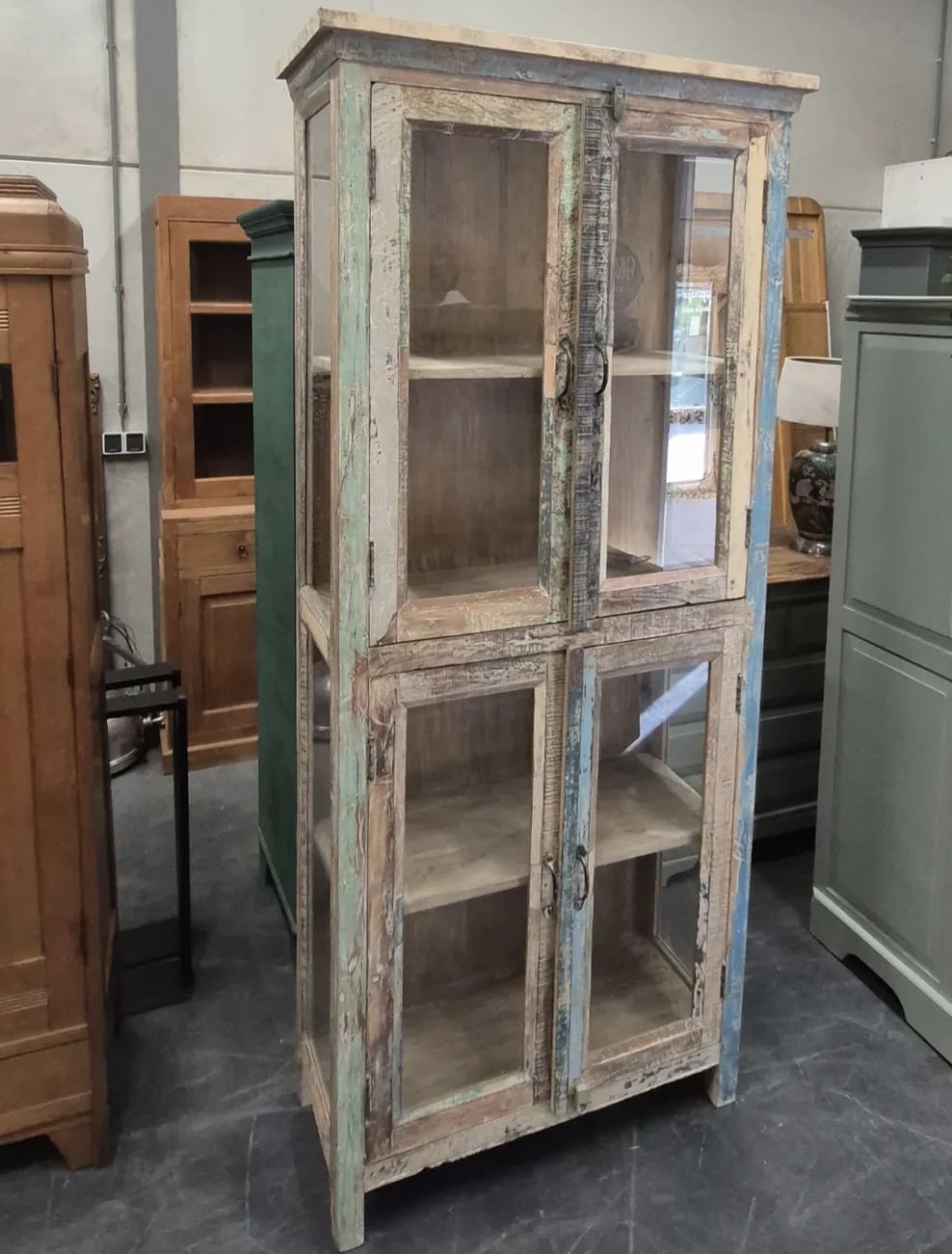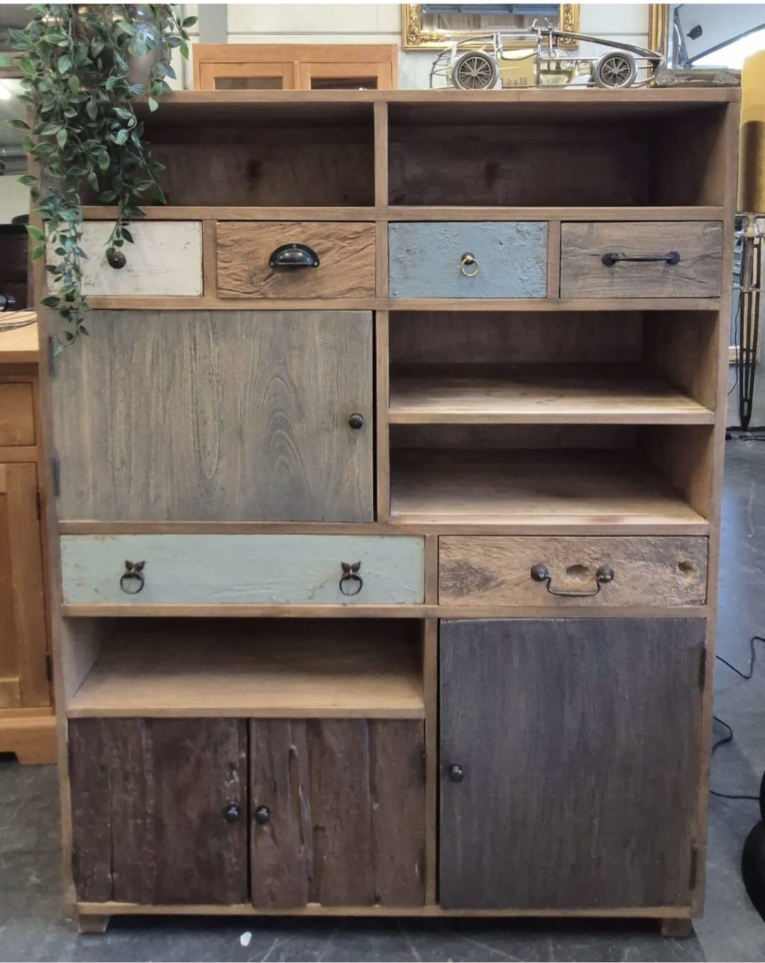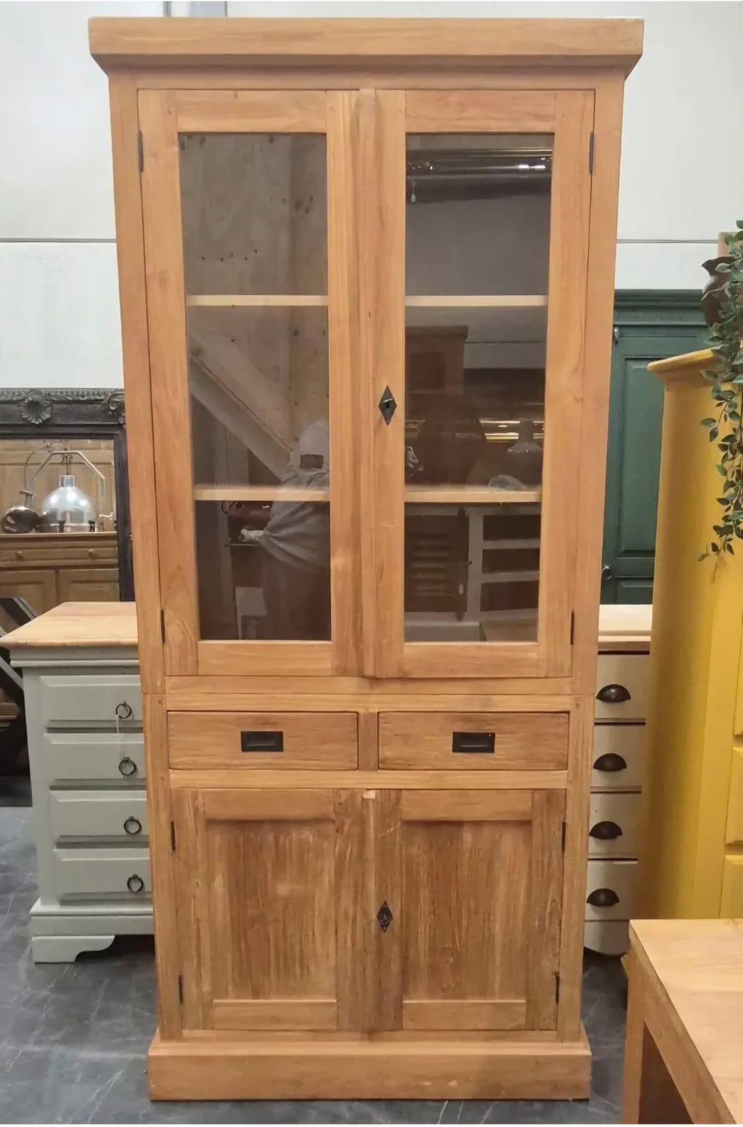 Deze prachtige vitrinekast van massief teakhout combineert rustieke charme met praktische opbergruimte. De kast is voorzien van twee ruime lades onderin én een open vitrinekast bovenin – ideaal om je mooiste items uit te stallen.