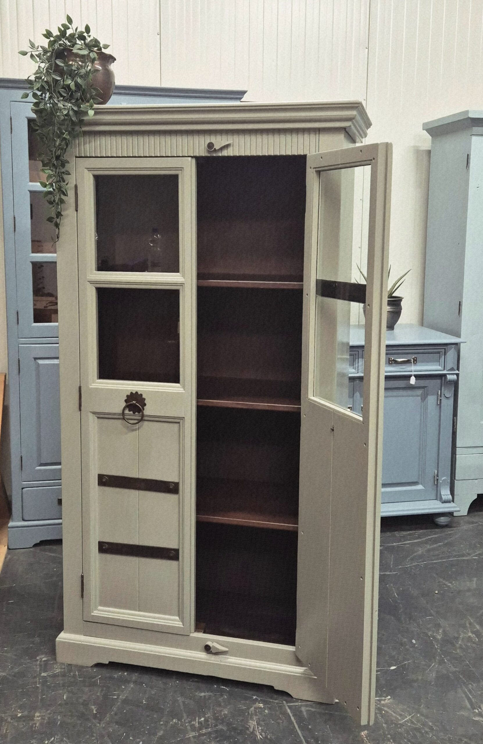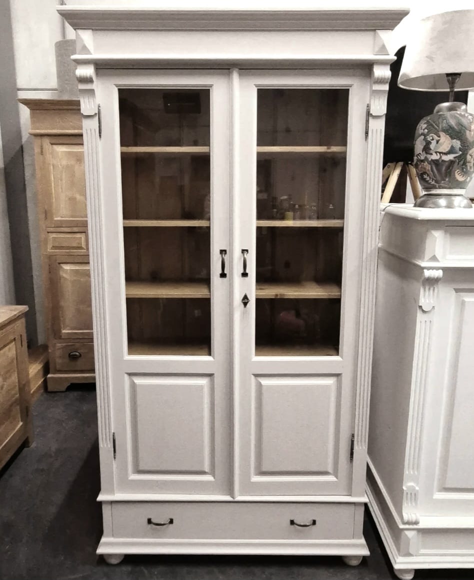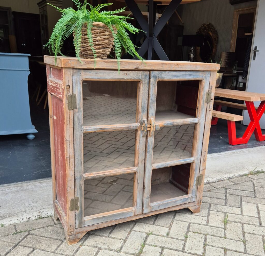 Deze prachtige brocante vitrinekast met elegante details brengt direct sfeer en authenticiteit in je interieur.