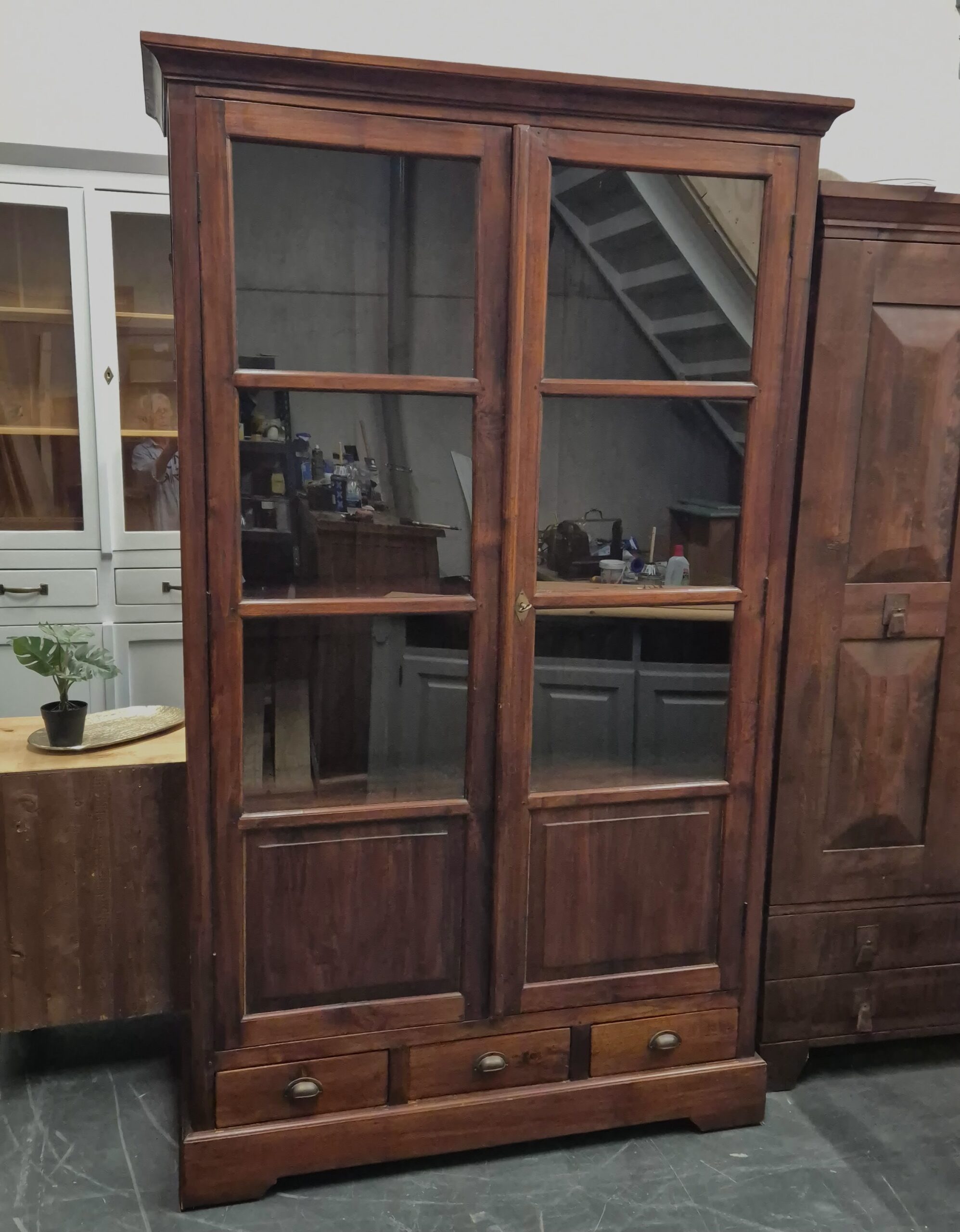 Stijlvolle vitrinekast van massief teakhout met glas aan de voor- en zijkanten – perfect om je mooiste items of verzamelstukken in tentoon te stellen.