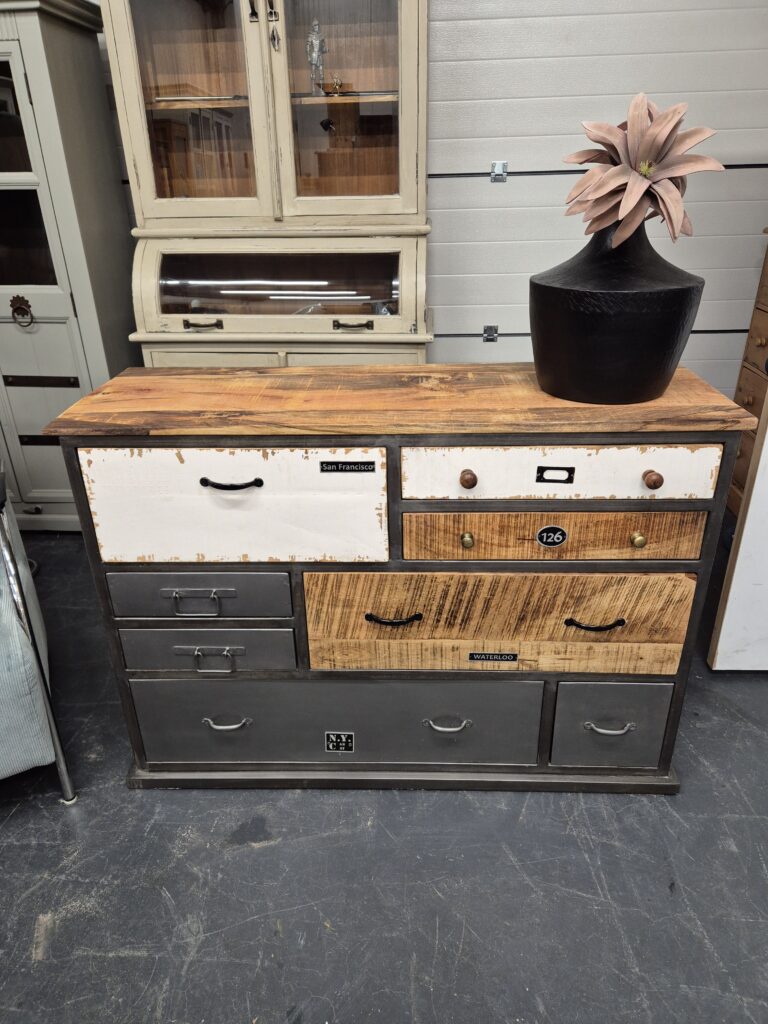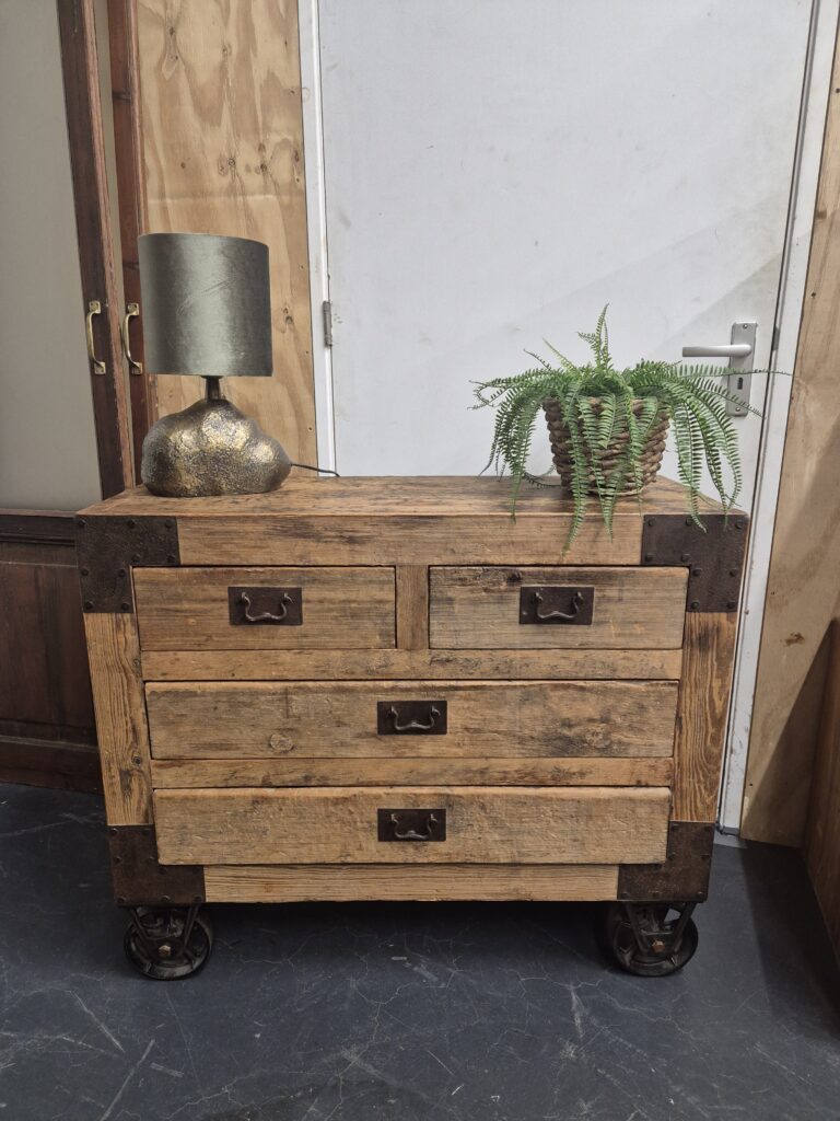 Voorzien van 2 deurtjes en 3 handige laatjes — een echte blikvanger met een stoer, authentiek tintje!