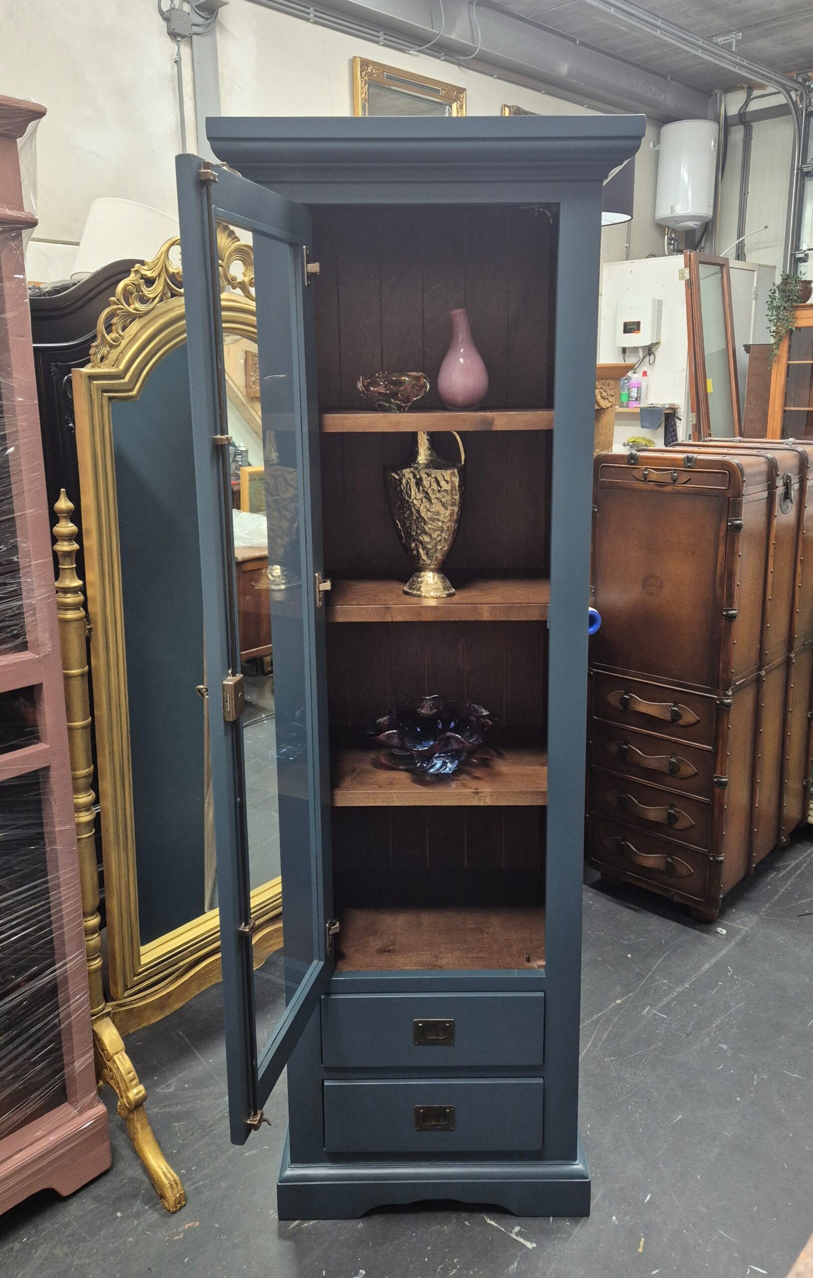 Deze slanke teakhouten vitrinekast, geverfd in de kleur Hague Blue is ideaal voor kleinere ruimtes maar waar je toch nog leuke decoratie of boeken in kwijt kan.