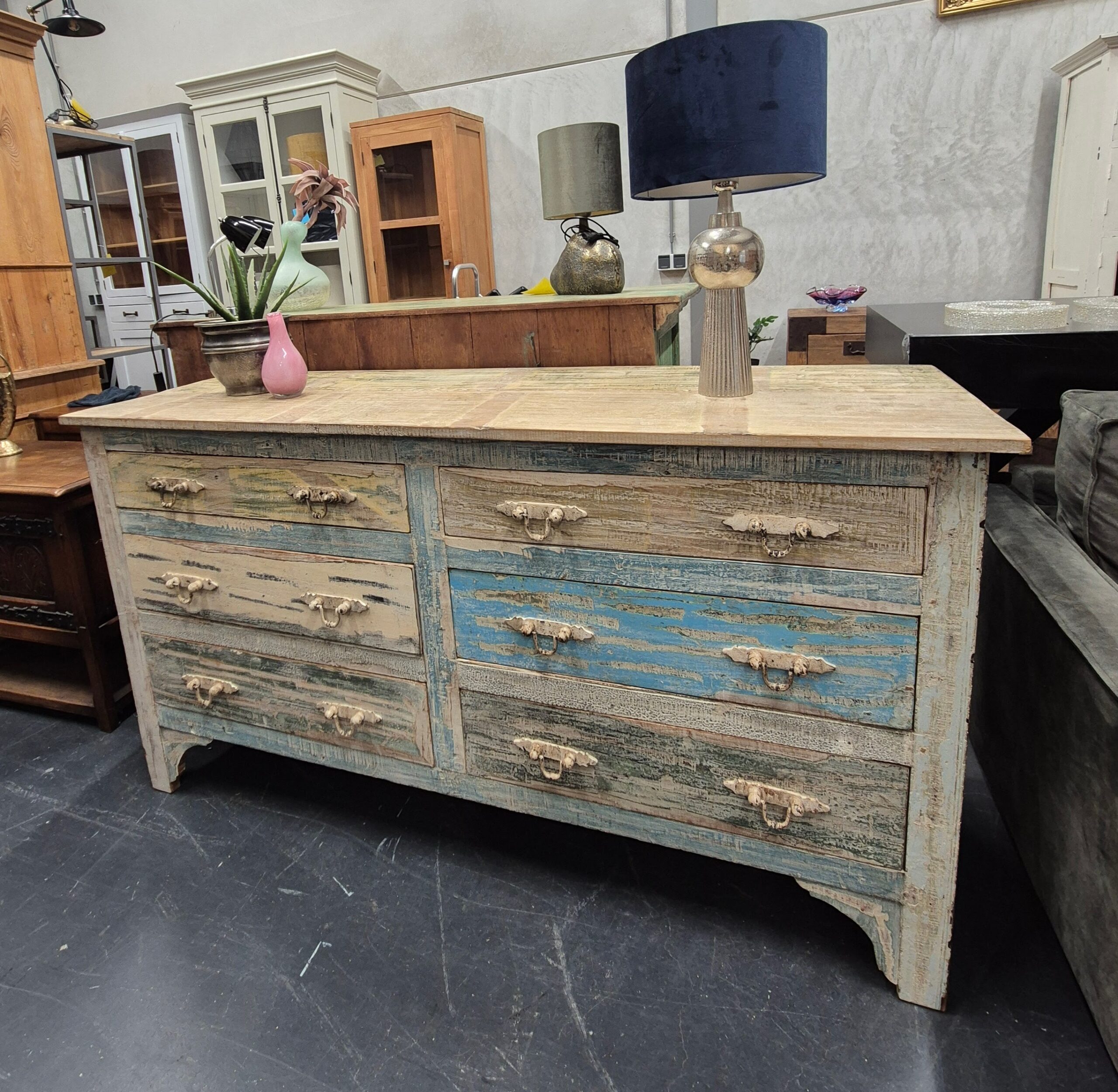 Robuust Indiaas dressoirtje van massief teakhout, vol karakter en kleur.
