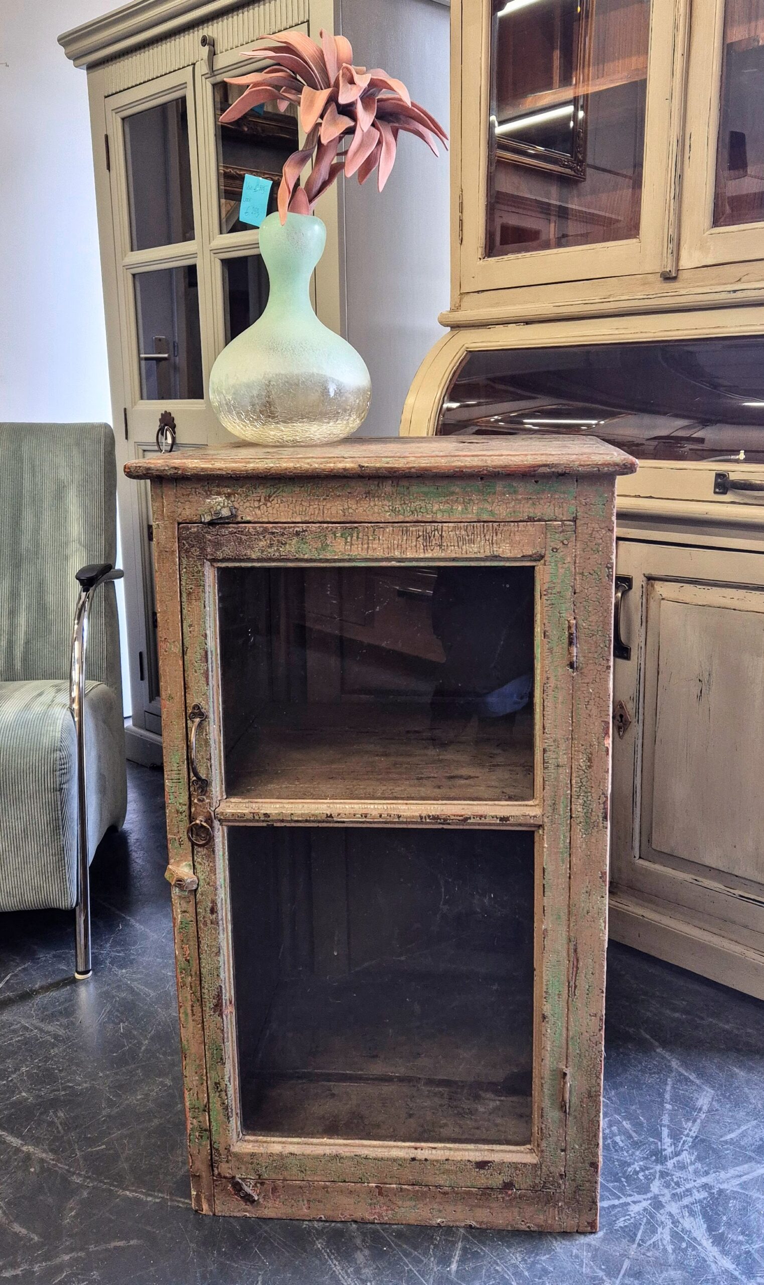 Dit prachtige kleine vitrinekastje uit India, gemaakt van massief teakhout, straalt authenticiteit en vakmanschap uit.