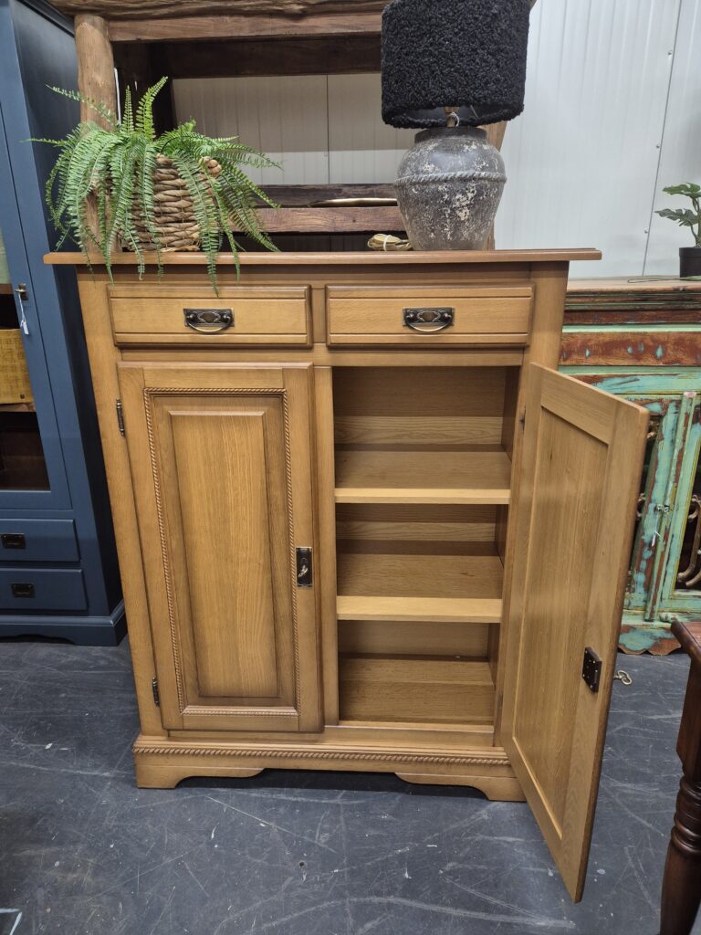 Dankzij de praktische indeling – met ruime legplanken en een handige lades– biedt deze kast verrassend veel opbergruimte.