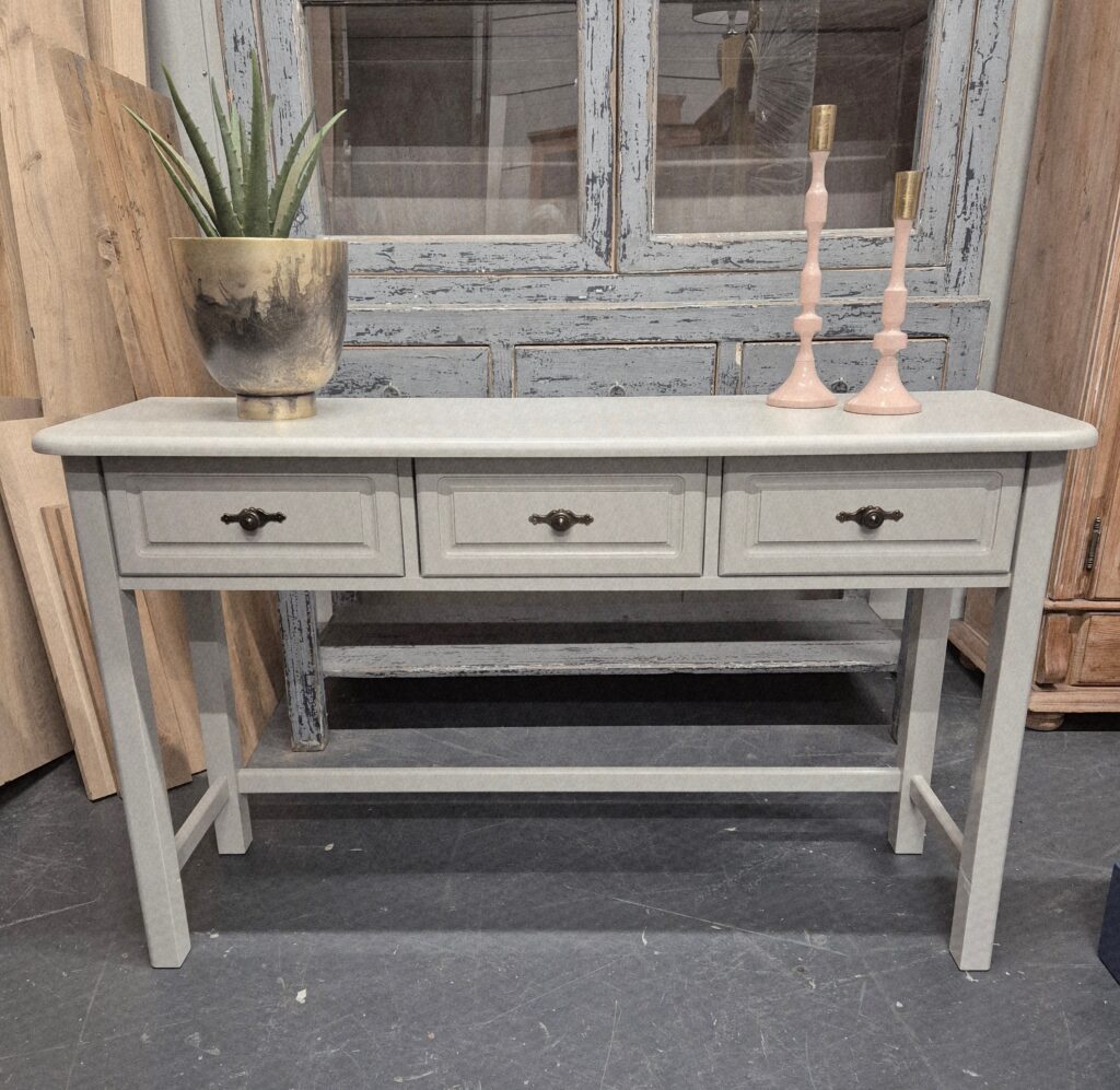 Deze eikenhouten sidetable in de kleur Rolling Fog is perfect voor in de hal, woonkamer of eetkamer en combineert moeiteloos met zowel klassieke als landelijke interieurs.
